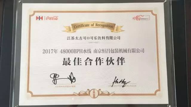 7月4日,江蘇太古可口可樂有限公司舉行了一場盛大的“新水線運(yùn)營揭幕儀式”。作為該項(xiàng)目后段包裝總包商,南京恒昌包裝機(jī)械有限公司獲邀參加儀式,并得到了太古可樂的高度肯定,獲得“最佳合作伙伴”殊榮!